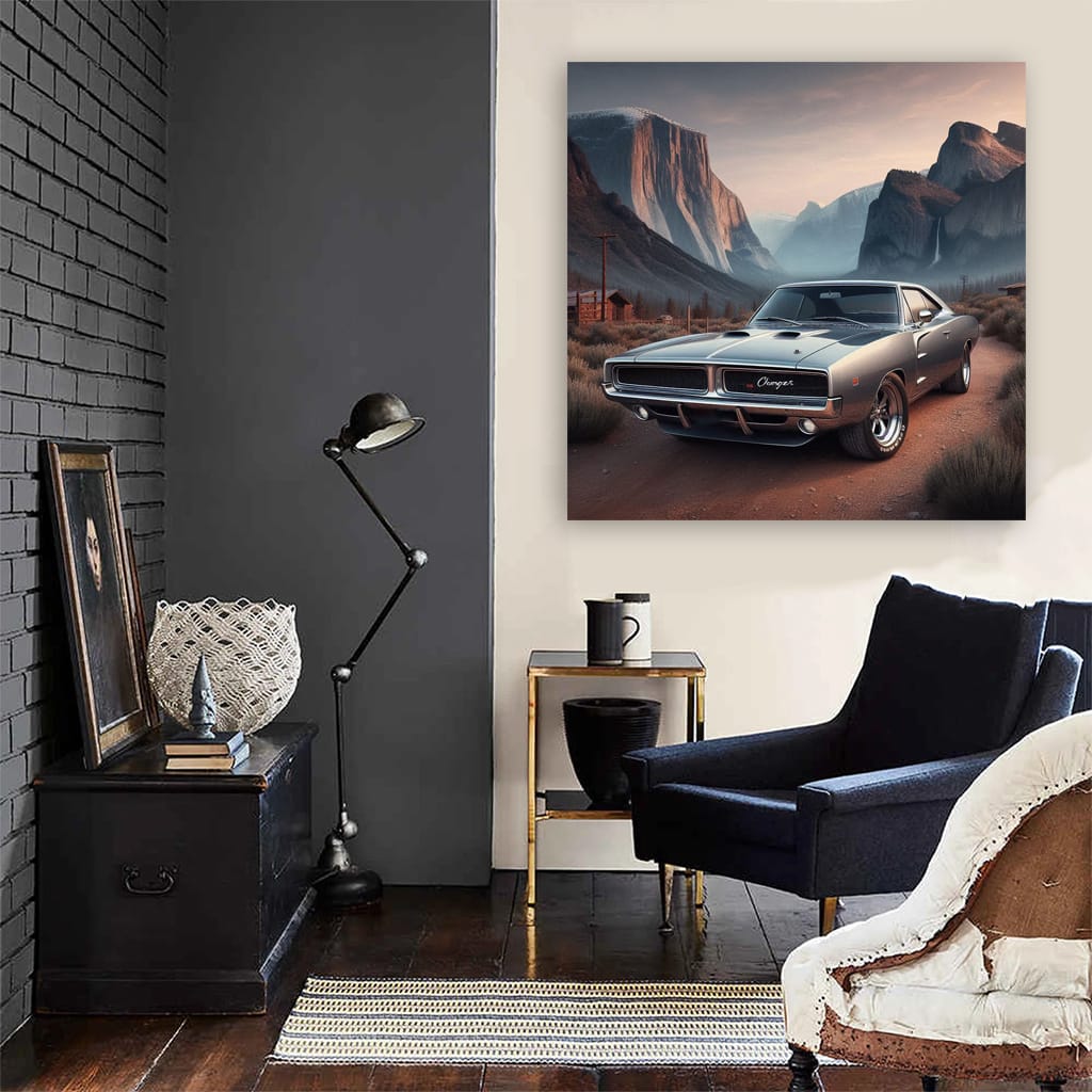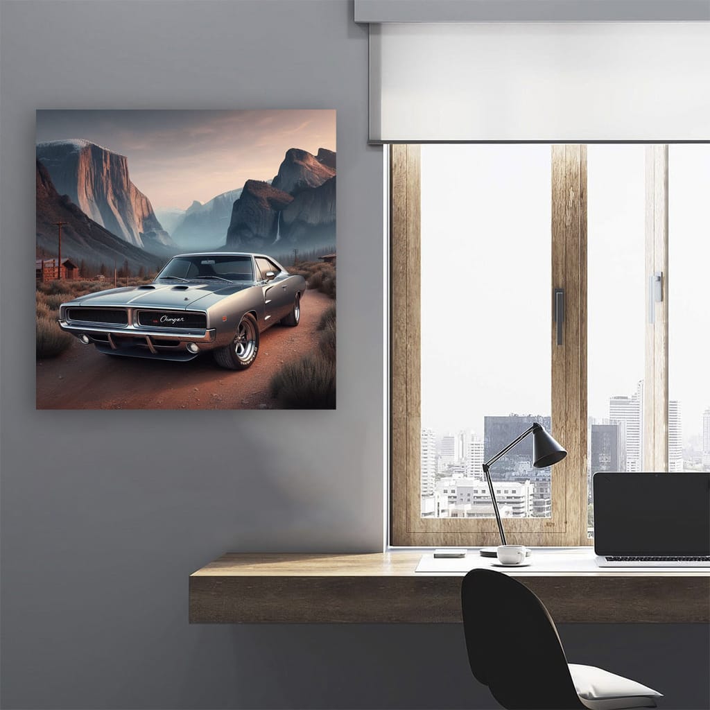 This 1970 Dodge Charger R/T poster is a real boss among wall art. The picture embodies power and aggression, as if a V8 is roaring on your wall. This is for those who understand a lot about brutal classics and are ready to pump up the atmosphere of their garage or room to the next level. See more from the collection: Dodge Art