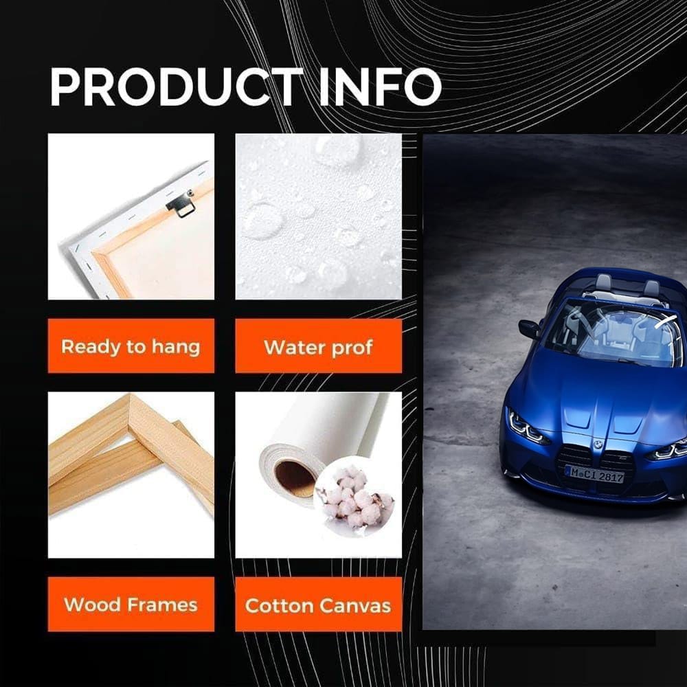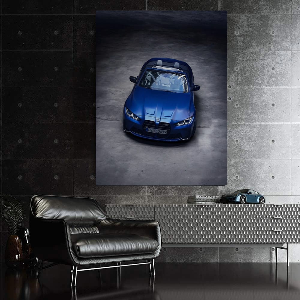 This painting is just a bomb! BMW M4 Competition Convertible in blue on the poster is wall art for real fans of cars. With this painting on the wall, your garage will become a place of power, where the roar of engines and adrenaline are in the blood. See more from the collection: BMW 4 Series Art