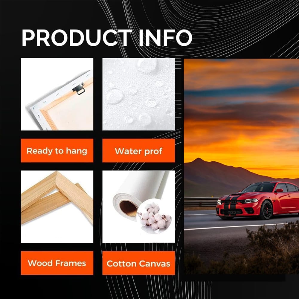 Imagine, this poster with a Dodge Challenger is really the bomb! Wall art for those who are in the know. This painting is like a sip of adrenaline, reminding you of the roar of the engine and speed. Hang it up and feel how your hut is gaining momentum. See more from the collection: Dodge Art