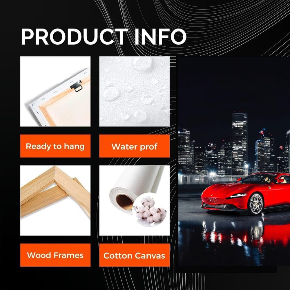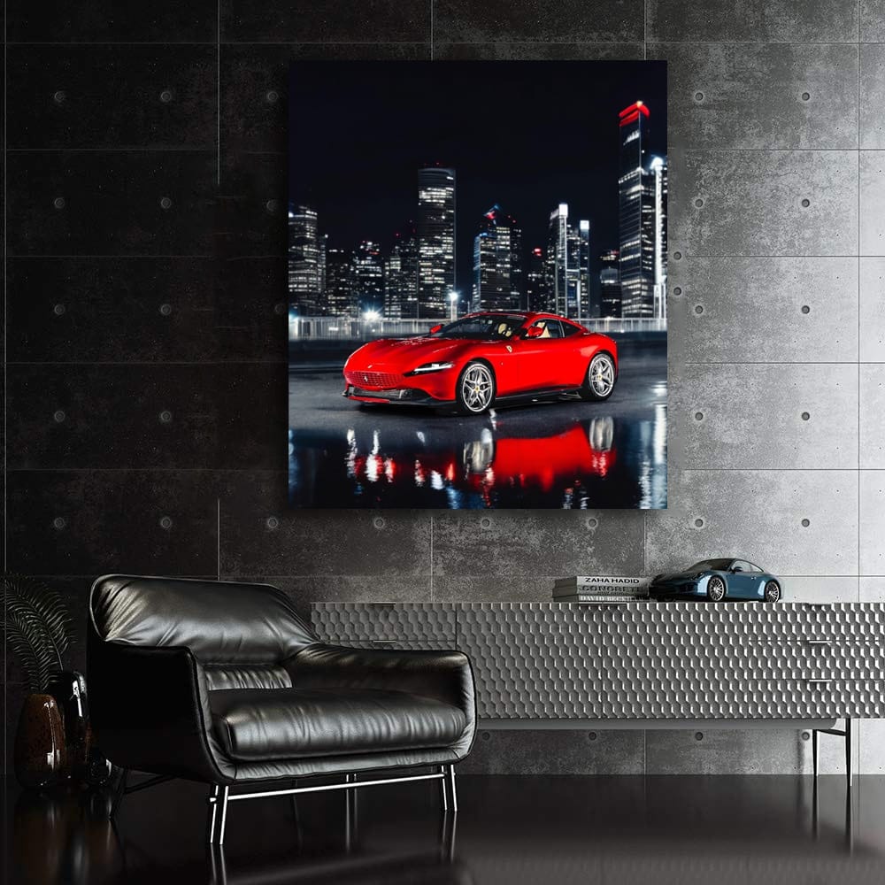This poster is like a business card for a real benzaphil. Ferrari Roma on the night track is a painting that gives you goosebumps. Wall art for those who understand that power and style in one frame are not toys. See more from the collection: Ferrari Art