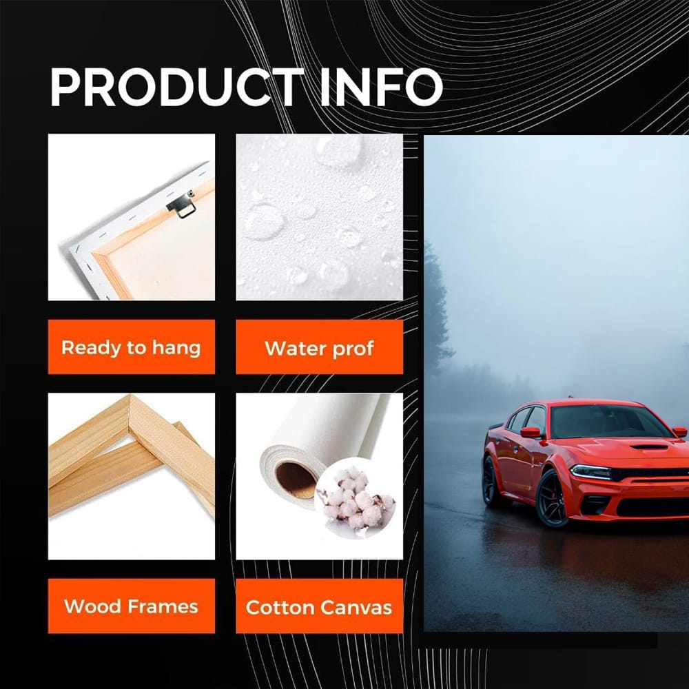 painting this: a poster of a Dodge Charger, like a ghost from the fog. This is not just a painting, this is a real time machine. Wall art for those who know a lot about speed and power. Hangs on the wall and takes you to the world of roaring engines. See more from the collection: Dodge Art