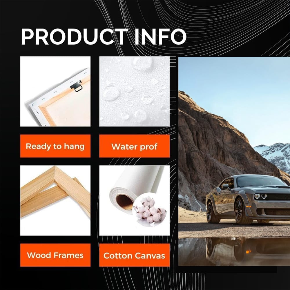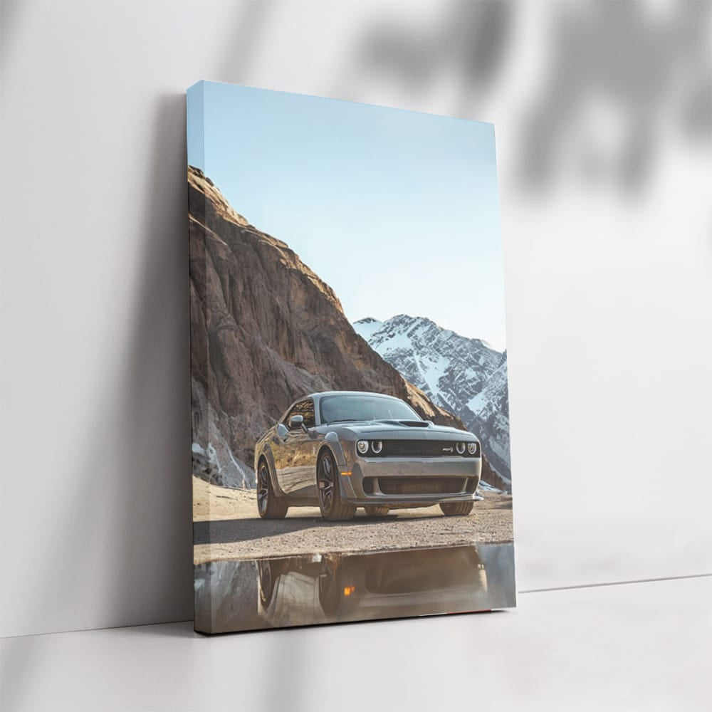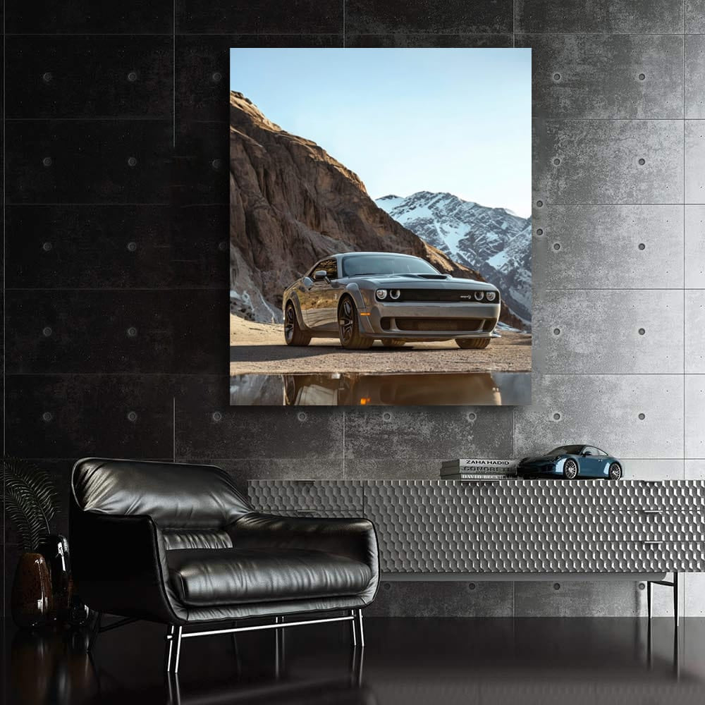This painting is a real masterpiece for a car enthusiast. Wall art with Dodge Challenger against the backdrop of mountains is like the roar of the engine that you hear in your soul. The poster screams about speed and power, challenging the peaceful nature. Perfect for your garage! See more from the collection: Dodge Art
