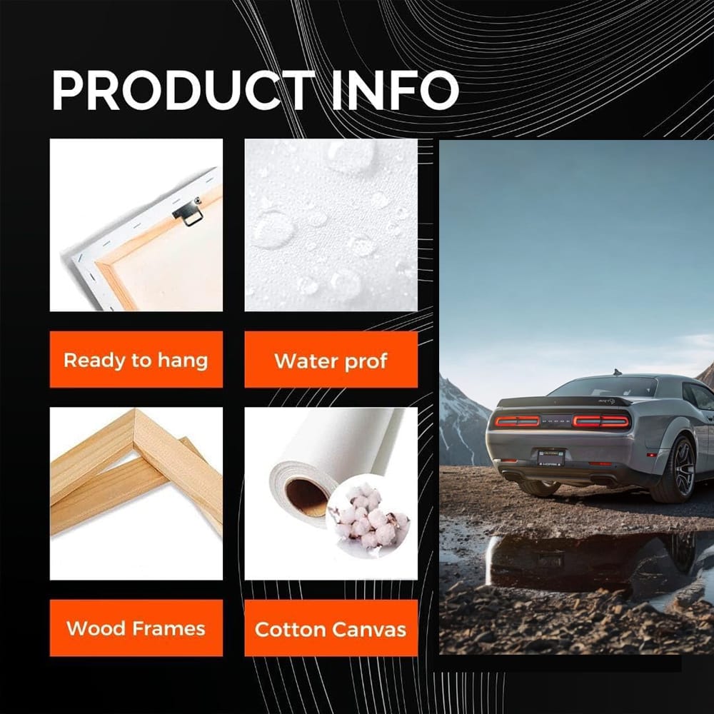There's a poster of a Dodge Challenger on the wall, what a beast! This painting is a car fan's dream. Wall art that makes the engine inside roar. The mountains in the background add to the wildness, as if you're on the edge. Just fire! See more from the collection: Dodge Art