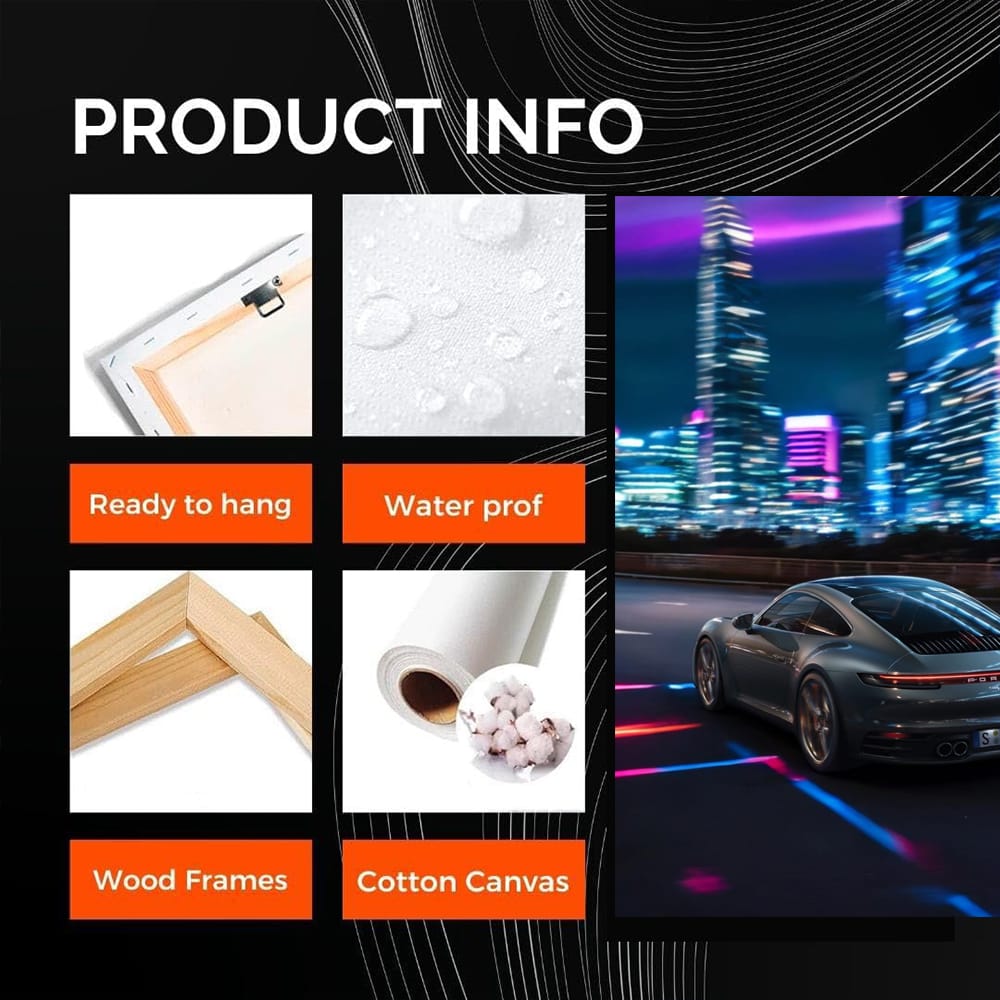 This poster is pure joy for a car fan. The painting of a Porsche 911 captured at night in the city is a real bomb. Wall art that will instantly add a boldness to any wall. Anyone who comes in will immediately understand: a true connoisseur of speed and style lives here. See more from the collection: Porsche 911 Art