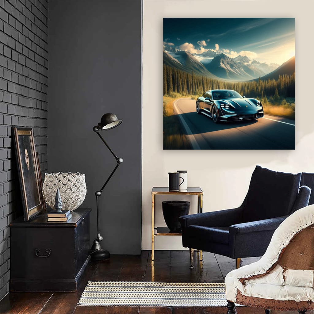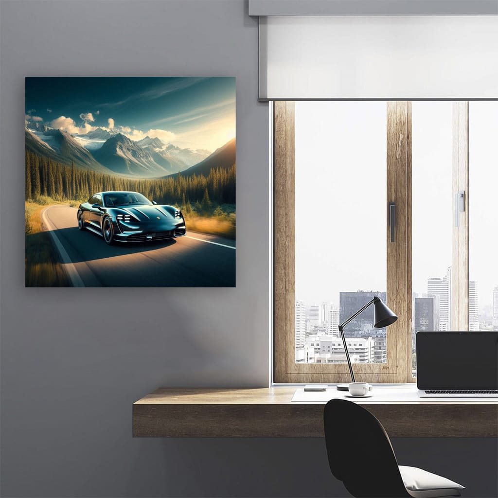 This poster is like a lightning strike: a Porsche Taycan against the backdrop of a valley where the roar of the engine merges with the rustle of the wind. The painting bursts into the interior like a rocket car on the track. Wall art for those who live at the top speed. See more from the collection: Porsche Art