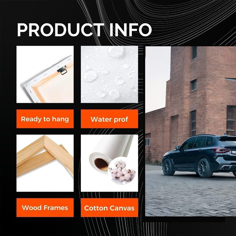 Dude, this poster of a black BMW X3 G01 is just the bomb! This painting on the wall is like adrenaline for a car fan. Wall art that gives you goosebumps. Once you see it, you will immediately understand that this is a real beast in the world of cars. See more from the collection: BMW Art